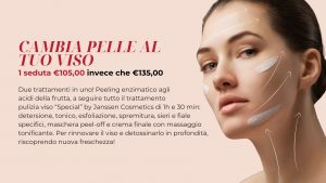 1 seduta €105,00 invece che €135,00 : Due trattamenti in uno ! Peeling enzimatico agli acidi della frutta, a seguire tutto il trattamento pulizia viso “Special” by Janssen Cosmetics di 1h e 30 min: detersione, tonico, esfoliazione, spremitura, sieri e fiale specifici, maschera peel-off e crema finale con massaggio tonificante. Per rinnovare il viso e detossinarlo in profondità, riscoprendo nuova freschezza !