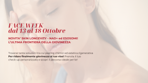 FACE WEEK dal 13 al 18 ottobre: NOVITÀ SKIN LONGEVITY – NAD+ ed ESOSOMI! L’ULTIMA FRONTIERA DELLA GIOVINEZZA! Troverai tante soluzioni tra cui peeling chimici ed estetica rigenerativa per dare finalmente giovinezza al tuo viso! Prenota il tuo check-up personalizzato e scopri il percorso ideale per te!