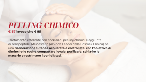 PEELING CHIMICO: € 67 invece che € 85, Trattamento esfoliante con cocktail di peeling chimici e aggiunta di senopeptide, Mesoestetic (Azienda Leader della Cosmesi Clinica) per una rigenerazione cutanea accelerata e controllata, con l’obiettivo di diminuire le rughe, compattare l’ovale, purificare, schiarire le macchie e restringere i pori dilatati.