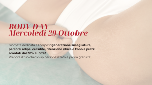 MERCOLEDI’ 29 BODY DAY Giornata dedicata al corpo: rigenerazione smagliature, percorsi adipe, cellulite, ritenzione idrica e tono a prezzi scontati dal 30% al 50%! Prenota il tuo check-up personalizzato e prova gratuita!